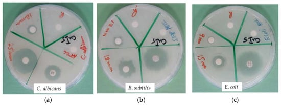 The disc diffusion (DD) studies with positive controls (antibiotic). From left to right: Title compound against (a) C. albicans WDCM 00054; (b) B. subtilis WDCM 00003; and (c) E. coli WDCM 00013.