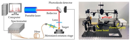 The experiments were carried out with the LIBS system shown in Figure 1. A self-developed portable Nd:YAG laser was used as the ablation light source, which could deliver 7 mJ pulse energy at its fundamental wavelength with an energy fluctuation of 0.8%. The laser pulse duration was smaller than 2 ns at 10 Hz repetition rate. The laser beam was focused on the sample using a quartz lens with 60 mm focal length. Plasma emission was focused on a bifurcated fiber cable by a pair of plano-convex lenses. The fiber was connected to a six-channel fiber optic spectrometer (AvaSpec Multi-Channel, Avantes, NLD, Apeldoorn, The Netherlands) with a spectral resolution of 0.08~0.11 nm in the range of 220~880 nm. The signals were recorded by CCD detectors with 2 ms minimum gate width. A photodiode detector was mounted behind the reflection mirror to monitor remaining laser pulses and trigger the spectrometer. The samples were stuck in a 360° motorized rotation stage to refresh the target point and avoid the destruction of samples. All of the experiments were carried out in air without any control of the surrounding atmosphere.