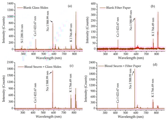 The LIBS spectra of samples and their blank supports. (a) Blank glass slides; (b) blank filter paper; (c) blood serum deposited on glass slides; (d) blood serum deposited on filter paper.