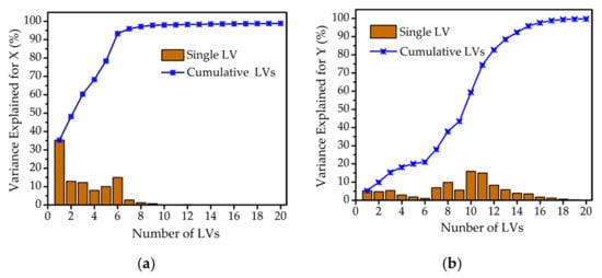 Figure 3 shows the description of variance explained by single LV and cumulative LVs for matrix X and Y. As shown in Figure 3a, the information of variance explained by the single LV had almost no contribution when the number of LVs exceeded 9. More than 90% of the variance information for matrix X was explained by the cumulative LVs. However, the variance information for matrix Y only increased to 80%, accumulating 12 LVs, as shown in Figure 3b. So, the number of LVs from 12 to 20 was optimized for the most accurate PLSR model.