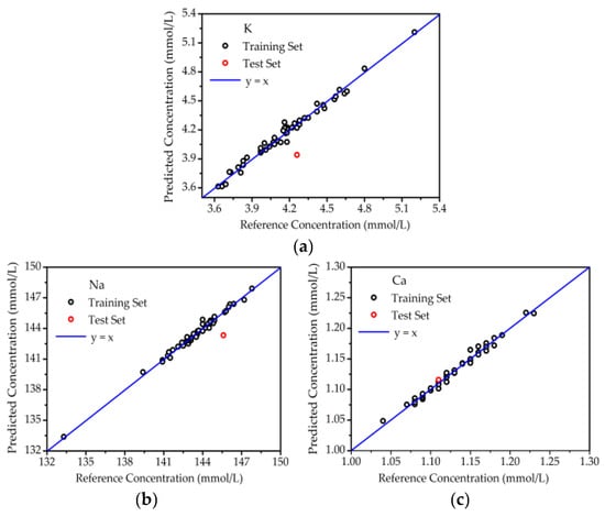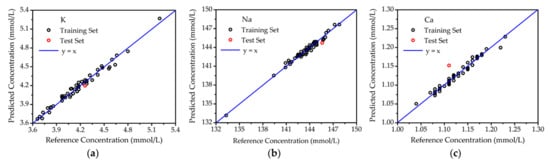 The results of optimal PLSR are shown in Figure 5 for the samples deposited on glass slides. Both the training set and test set were predicted by the PLSR model, respectively. The reference concentrations of elements K, Na, and Ca were provided by a medical electrolyte analyzer (CBS-400), and the PLSR predicted concentrations were measured by LIBS. The correlation between reference concentration and PLSR-predicted concentration was revealed with the aid of reference curve y = x. In Figure 5, all of the points for the training set were close to the reference curve, showing great agreement between reference and predicted concentrations. This meant the PLSR model was reliable. For the test set points, the predicted concentrations of K, Na, and Ca were also highly consistent with the reference concentrations. As listed in Table 1, the prediction accuracies for K, Na, and Ca were 1.45%, 0.61% and 3.80%, respectively. Hence, the PLSR model was also verified to be accurate.