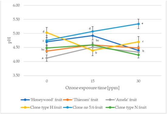 Changes in the pH of the Saskatoon berry during ozone exposure. Data are expressed as mean values (n = 3) ± SD; SD—standard deviation. Mean values with different letters are significantly different (p < 0.05).
