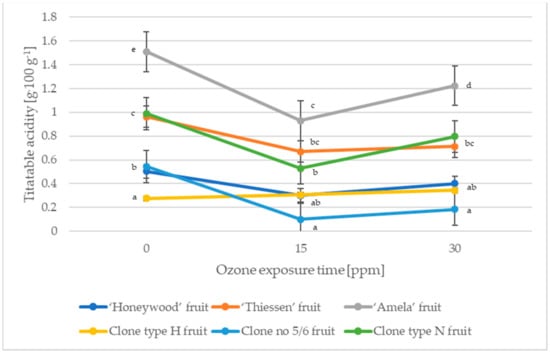 Changes in the acidity of the Saskatoon berry fruit during ozone exposure. Data are expressed as mean values (n = 3) ± SD; SD—standard deviation. Mean values with different letters are significantly different (p < 0.05).