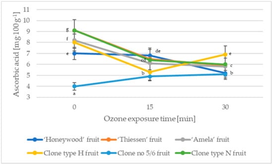 Changes in the ascorbic acid of the Saskatoon berry fruit during ozone exposure. Data are expressed as mean values (n = 3) ± SD; SD—standard deviation. Mean values with different letters are significantly different (p < 0.05).