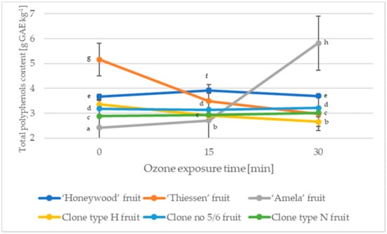 Changes in the total polyphenolic content of Saskatoon berry fruit during ozone. Data are expressed as mean values (n = 3) ± SD; SD—standard deviation. Mean values with different letters are significantly different (p < 0.05).