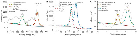The valence of the cobalt, tungsten, and arsenic atoms in CAW was assessed by using X-ray photoelectron spectroscopy (XPS). As shown in Figure 3A, the XPS spectrum with two peaks located at 795.1 and 779.5 eV can be assigned to Co 2p1/2 and Co 2p3/2, and the fitted curve may imply that the valences of Co in CAW are all in +2 [30,31]. As can be seen in Figure 3B, there are two peaks located at 36.9 and 34.8 eV, which could be caused by W 4f7/2 and W 4f5/2, respectively [32]. The fitted dashed curves in Figure 2 suggest the association of the W 4f peaks with W6+ [32]. Furthermore, as shown in Figure 3C, the fitted dashed curves at 44.28 and 39.26 eV may imply that the +5 valence As ions are present in CAW [33], which is same as the evidence from the tetrahedral configuration.