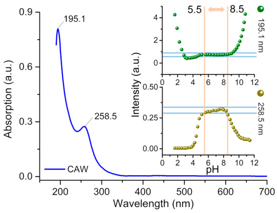 The effect of pH on the stability of CAW has also been explored using UV–Vis spectroscopy. As can be seen from insets of Figure 5, insignificant variations are noted in the intensity of CAW UV–Vis absorption within a range of pH from 5.5 to 8.5 pH. Outside this range, the absorption peak intensities at 195.1 and 258.5 nm change progressively, implying the commencement of skeletal collapse within the CAW. The pH range for CAW stability can therefore be assumed to be between 5.5 and 8.5.