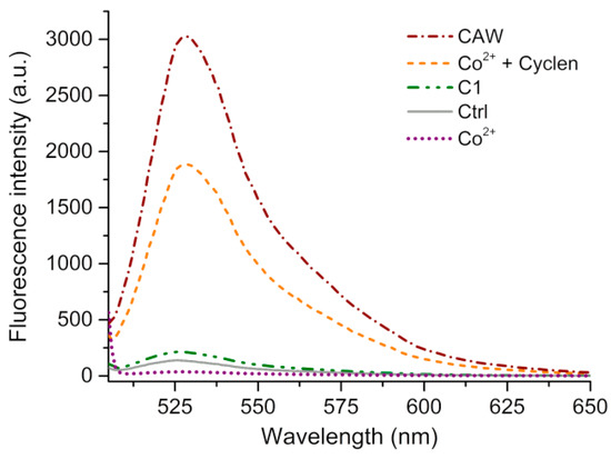According to a recent study, transition metal ion-substituted phosphomolybdate possesses a catalytic oxidative function [9]. For this reason, dichlorofluorescein (DCF) assay was utilized to explore the CAW-mediated production of ROS. As DCF is a fluorescent probe formed through the reaction of DCFH-DA (non-fluorescent) with ROS in the presence of HRP, it can be an indicator of ROS release from the system [41]. As shown in Figure 6, CAW exhibits a much more intense fluorescent spectrum (λem = 528 nm) than the control group sample, suggesting a richer ROS output with CAW than without. {[C5H6N]10}{Co4(H2O)2[AsW9O34]2} (abbreviated as C1) and CoCl2 + cyclen (abbreviated as Co2+ + cyclen) groups also have catalytic effects. However, the CAW sample exhibits 10x more fluorescence than the C1 and 2x more than Co2+ + cyclen group samples. It is of note that the fluorescence intensity of the Co2+ group sample is very low, even lower in comparison with that of the control group, suggesting a remarkably lower output of ROS by the group with Co2+. This can probably be attributed to the transition metal ion–HRP enzyme interaction leading to a loss in the Co2+ group’s catalytic properties [42]. It is likely that, as well as facilitating synergistic production of ROS, the POM fragment in concert with the Co clusters and Co(cyclen) complexes may also avoid disturbance of the catalytic centers.
