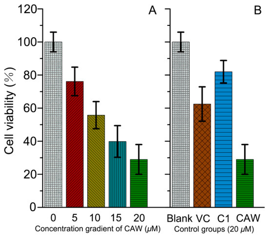 PC12 cell viability determined by MTT assay. (A) After incubation with CAW of different concentration gradients (0, 5, 10, 15, 20 μM) for 24 h. (B) Incubation of different control groups (Ctrl: blank group; VC: 20 μM CAW + 20 μM ascorbic acid; CAW: 20 μM CAW; C1: 20 μM {[C5H6N]10}{Co4(H2O)2[AsW9O34]2}) at 37 °C for 24 h.