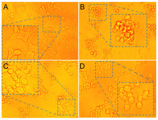 Photomicrographs of cells after incubation with 20 μM CAW for (B), 20 μM {[C5H6N]10}{Co4(H2O)2[AsW9O34]2} for (C), 20 μM CAW + 20 μM ascorbic acid for (D), and blank group for (A) in the culture medium at 37 °C for 24 h.