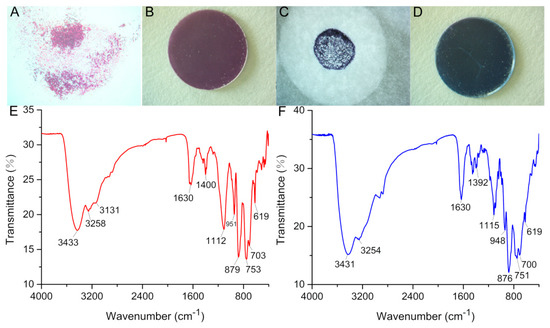 Crystal micrograph for (A), color of KBr tablets for (B), and IR spectrum for (E) of unincubated CAW; and crystal micrograph for (C), color of KBr tablets for (D), and IR spectrum for (F) of CAW incubated with MB.
