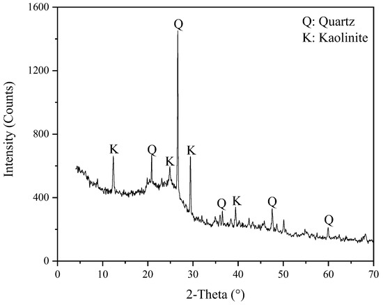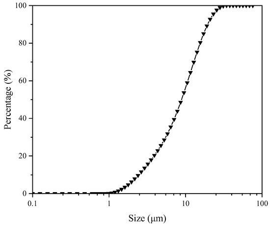 The results showed that the ash content (Aad) and the moisture content (Mad) of the sample were 16.74% and 7.35%. The air-drying volatile matter (Vad) and the fixed carbon (FC) content were 38.34% and 54.67%. In order to investigate the types of minerals in the LRC slurry, X-ray diffraction analysis was performed. The result is shown in Figure 1. Quartz and kaolinite were the mineral impurities in the sample. A laser diffractometer (Malvern Mastersizer 2000, Malvern Panalytical, London, UK) was used to measure the particle size distribution of the sample particles, and the results of the particle size test was shown in Figure 2. The d50, d80, and d90 values of the coal samples were 8.617, 15.576, and 18.975 μm, which indicated that the coal samples were microfine samples.