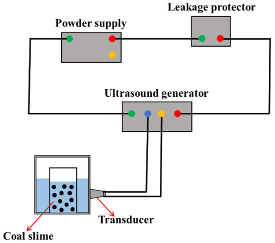 The schematic diagram of the ultrasonic pretreatment system is shown in Figure 3. The ultrasound action system consisted of an ultrasound generator (SL-650SD, Nanjing Hanzhou Technology Co., Ltd., Nanjing, China) and several ultrasound transducers. The frequencies of the selected transducers were 10, 20, 30, 40, and 50 KHz. The maximum output power of the ultrasonic generator was 1100 W, and the maximum output power of several ultrasonic probes was 100 W. The ultrasound amplitude ranged from about 80 to 100 μm. The bath was rectangular in cross section, with a length of 200 mm, a width of 150 mm, and a height of 130 mm. During the ultrasonic pretreatment, the temperature change in the bath was about 2 °C. In the ultrasonic pretreatment, first, APAM was added into the slurry suspension and stirred for 5 min, and then the slurry was placed in the ultrasonic system for the corresponding time.