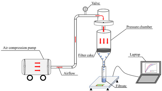 The LRC slurry filtration equipment is illustrated in Figure 4. The pressure of the filtration equipment was set at 0.2 MPa, and the slurry was quickly poured into the filtration equipment at the beginning of the filtration experiment. The cake and filtrate were then collected, and the filtration time was recorded. The filtrate was collected as the filtration experiment proceeded. After filtration, the aqueous filter cake was collected and weighed. Afterwards, the filter cake was dried at 60 °C, and the weight of the dried filter cake was recorded. The method of filter cake moisture content calculation is given by Equation (1):