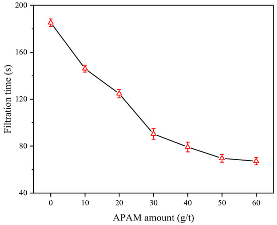 The flocculant dosage is critical to achieve efficient flocculation and filtration of slurry. Figure 6 illustrates the variation of the slurry filtration time with the increase in APAM dosage. The results indicated that the filtration time of coal slurry was gradually reduced with increased APAM dosage. When the APAM dosage was increased from 0 to 50 g/t, the slurry filtration time was decreased from 185.2 to 69.6 s. When the APAM dosage exceeded 50 g/t, the change of slurry filtration time tended to be stable.