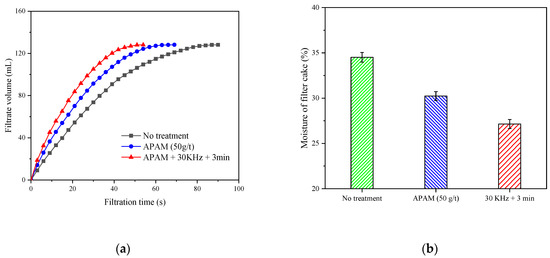 The trend of filtrate volume change with increasing filtration time is shown in Figure 8a. The variation of the slurry filtration rate could be reflected by the slope of the curve, and the larger the slope, it indicated that the filtration rate of the slurry was faster. Clearly, the filtration rate of the slurry was significantly increased after the ultrasonic pretreatment. Figure 8b shows the moisture content of the filter cake under different conditions. The APAM led to a filter cake moisture content of 30.2%, whereas the moisture content of the filter cake decreased to 27.1% after ultrasonic pretreatment. This indicates that ultrasonic pretreatment could reduce the filter cake moisture content.