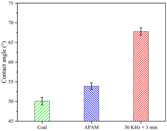 The hydrophilic groups on the surface of LRC was an important factor affecting the contact angle and hydrophobicity of the particles [28,29]. Figure 9 shows the LRC slurry contact angle under different conditions. The coal contact angle was 50.1°, which was increased to 53.9° after the addition of APAM. However, after ultrasonic pretreatment, the contact angle of LRC increased significantly to 67.8°. Since the surface of LRC is abundant in oxygen-containing functional groups—thus, its surface is more hydrophilic—and it is not conducive to the reduction of filter cake moisture [5]. Meanwhile, ultrasonic pretreatment could enhance the dispersion of APAM in the solution environment [30]. This presumed that the ultrasonic pretreatment enhances the interaction between reagents and particles to increase the contact angle and hydrophobicity of the coal surface, thus improving water mobility and promoting filtration.