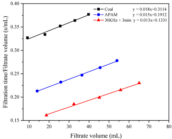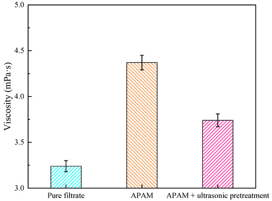 Figure 10 shows the changes of filtrate viscosity before and after ultrasonic pretreatment. The results show that the filtrate viscosity decreased from 4.37 to 3.74 mPa·s after ultrasonic pretreatment. It is speculated that the reason for the above phenomenon is that the ultrasonic pretreatment affected the displacement of APAM molecules and the adsorption of APAM molecules on the particle surface in the coal sludge water system [31]. The decrease in filtrate viscosity leads to an increase in its local Reynolds number, which results in a decrease in drag coefficient and resistance. Therefore, ultrasonic pretreatment helps to reduce the filtrate viscosity and thus improves the coal slurry filtration performance. In addition, it is noteworthy that the viscosity with APAM addition is higher than the filtrate viscosity without APAM addition. This is mainly because APAM is a high-viscosity polymeric organic compound, and its addition increases the viscosity of the filtrate.