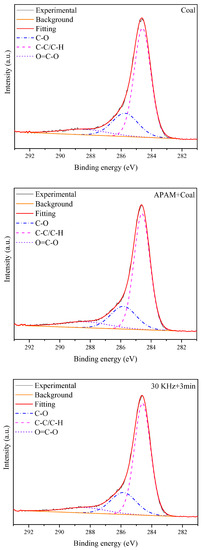 It was shown that the surface hydrophobicity of coal depends mainly on the relative content of hydrophilic and hydrophobic groups on its surface [32,33]. Figure 11 shows the C ls peaks of LRC slurry under different conditions. The groups C-C/C-H, C-O, and O=C-O correspond to peaks at 284.6, 285.6, and 289.1 eV, respectively [34]. Table 3 shows the contents of these three functional groups. The C-C/C-H content of the slurry surface was 68.02% after APAM addition, while the ultrasonic pretreatment increased the C-C/C-H content to 69.22%. Meanwhile, ultrasonic pretreatment reduced the C-O content on the surface of LRC slurry to 21.79% and the O=C-O content to 8.99%. It is assumed that this could be due to the ultrasonic pretreatment enhancing the adsorption capacity of APAM, which resulted in an increase in the hydrophobic strength of the coal surface. This is similar to the conclusion reached by A. Ozkan et al. [35], in which the ultrasonic treatment improved the adsorption of reagents on the colemanite surface and improved the filtration performance. Meanwhile, it is consistent with the contact angle test results.