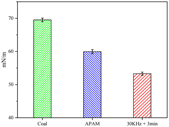 The surface tension of the filtrate affects the rheology and filtration resistance of the filtrate, thus affecting the coal slurry filtration [27,36]. Figure 12 illustrates the changes of the filtrate surface tension under different conditions. The results showed that ultrasonic pretreatment reduced the filtrate surface tension. The filtrate of pure LRC slurry showed a surface tension of 69.5 mN/m. The surface tension of the filtrate was reduced by APAM to 59.9 mN/m. Meanwhile, the surface tension of the filtrate decreased to 53.31 mN/m after ultrasonic pretreatment. The filter cake pore structure could be seen as many aggregations of capillaries with different pore sizes [37]. Meanwhile, the decrease in surface tension of the filtrate can improve the rheology of the filtrate and reduce the filtration resistance of coal slurry, which facilitates the removal of water from the filter cake [5].