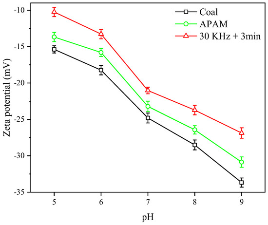 In slurry flocculation filtration, electrostatic repulsion between coal particles was the major force that inhibited particle flocculation [38]. The variation of the zeta potential was analyzed in Figure 13 under the different pH values. The results showed that ultrasonic pretreatment significantly reduced repulsive force between particles. When the filtrate pH = 7, the zeta potential of pure LRC slurry was −24.8 mV. APAM decreased the zeta potential of the slurry to −23.2 mV. After ultrasonic pretreatment, the zeta potential of the slurry was reduced to −21.0 mV. Generally, the farther the zeta potential value was from 0, the more stable was the suspension system. Meanwhile, the closer the zeta potential value was to 0, the weaker was the electrostatic repulsion between the particles, indicating that the suspension was more prone to flocculation [39,40]. This indicated that the ultrasonic pretreatment enhanced the interaction between APAM and particles, while reducing the particle surface potential and the repulsion between particles, thus contributing to the slurry flocculation.