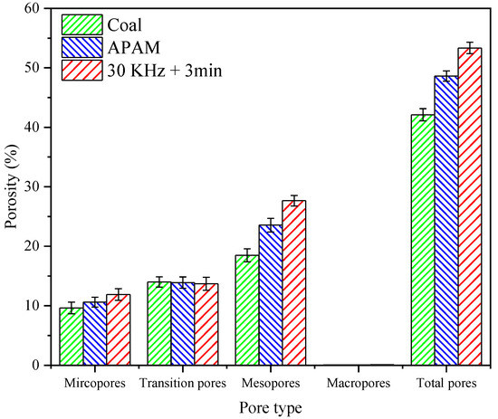 The filter cake porosity is one of the most important factors affecting the filtration rate of coal slurry [24]. The pores of the filter cake, according to the pore size, could be classified as micropores (0–10 nm), transition pores (10–100 nm), mesopores (100–1000 nm), and macropores (>1000 nm) [41]. Figure 15 and Figure 16 show the variation of pore distribution and porosity for different types of pores under different conditions, respectively. The results showed that micropores, transitional pores, and mesopores were the main types of pores contained in the filter cake, while no macropores were found in the cake. The slurry without reagent treatment had a cake porosity of 42.11%, while the addition of APAM increased the cake porosity to 48.61%. However, the filter cake porosity after ultrasonic pretreatment increased significantly to 53.34%, and this increased the filter cake porosity by 11.23%. From Figure 16, it could be seen that the ultrasonic pretreatment has little effect on the micropores and transition pores, but has a great effect on the porosity of the mesopores, which increased by 9.18%. According to the particle size test of the sample, the d90 value of the coal sample was 18.975 μm, which indicated that the sample size was fine; thus, the pore types of the filter cake included micropores, transitional pores, and mesopores. APAM promoted the increase in floc size by reducing the repulsion between coals and by bridging flocculation [25,42]. Meanwhile, ultrasonic pretreatment greatly reduced the surface potential of the particles and the electrostatic repulsion between the particles, which increased the floc size and promoted the increase in the filter cake porosity.