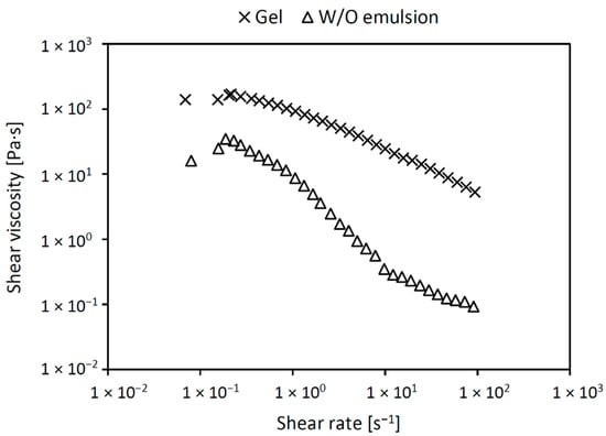 Viscosity curves of the gentamicin and vancomycin-loaded hypromellose gel (cross) and water-in-oil emulsion (triangle).
