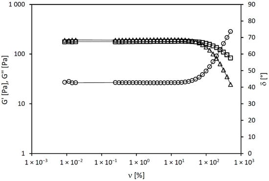 Elastic modulus G’ (triangles), viscous modulus G” (squares), and phase angle δ (circles) of the 3% hypromellose gel loaded with antibiotics.