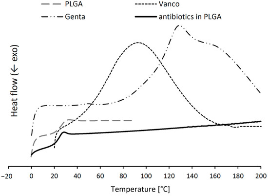 DSC thermograms of the pure PLGA polymer, the pure antibiotic powders, and the antibiotics loaded in a PLGA solid dispersion.