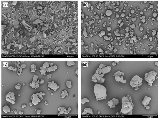 The morphologies of the vancomycin powder, gentamicin powder, and antibiotics-loaded PLGA particulates were determined by SEM (Figure 4). Vancomycin powder (Figure 4a) consisted of sharp-edged particles of irregular shapes. The particles of gentamicin (Figure 4b) were mostly spherical, sometimes also unevenly shaped, but smooth. The drug-loaded PLGA particles (Figure 4c,d) were rounded in shape with a smooth surface. Some small aggregates of these particles were also observed.