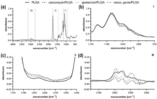 FT-IR spectra of the pure PLGA (a), the vancomycin-loaded PLGA, the gentamicin-loaded PLGA, and the both vancomycin and gentamicin-loaded PLGA. FT-IR spectra of region I (950−1150 cm−1) (b), region II (1450−1750 cm−1) (c), and region III (2750−3150 cm−1) (d).