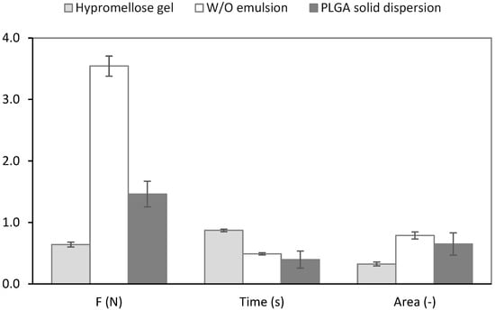 The adhesion of the formulations to the bone grafts was measured with a tensile test on an absolute rheometer. This test methodology is well established and allows key test variables to be set and maintained, particularly the temperature, contact time, consolidation force, and speed of detachment []. Figure 6 shows a comparison of the characteristics used in our work to evaluate the bioadhesion of depot formulations. The W/O emulsion required the highest force to break its adhesive bonds with the bone grafts, followed by the PLGA solid dispersion and the hydrogel. The wetting theory, involving surface and interfacial energies, can explain the higher bioadhesion of the W/O emulsion, caused by the effortless flow of liquid into the surface irregularities of the bone grafts [], whose hydrophobic surface is successfully wetted by the hydrophobic liquid emulsion system []. The hypothesis that a lower viscous emulsion would show lower adhesion in comparison with a gel was not confirmed. The PLGA solid dispersion, in the form of hydrophobic microparticles, had a worse adhesion to the bone grafts than the emulsion due to its rigid structure; however, it was still better than the hydrogel due to its hydrophobic nature and the branched structure of the chosen PLGA derivative. This adhesion could probably be increased by reducing the size of the particles, although this would likely accelerate polymer degradation and drug release. The hypromellose gel exhibited high adhesion to mucus, which contained 95% water, but it adhered poorly to the surface of bone grafts due to the lower possibility of hydrogen bonds formation. The time taken for the peak force to decay by 90%, as a comparative measure of the failure time, was significantly longer for that of the hydrogel in comparison with both the emulsion and PLGA, thanks to the viscoelastic properties of the bicoherent gel structure. On the other hand, the area under the force−time curve, attributed to the adhesive or cohesive strength, was significantly lower with that of the hydrogel. It could be assumed that the bioadhesion of the tested depot delivery systems detected by this test will also become manifest itself in vivo, which was confirmed through correlation studies [].