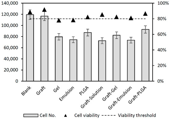 Bone marrow (BM) was obtained from one donor without any comorbidities undergoing total hip replacement due to osteoarthritis. Isolated and fully characterized BM- MSCs were treated according to standard operating procedures []. The cells were cultured on untreated plastics (TPP Petri-dishes and TPP Multi-Well Plates) at 37 °C under aerobic conditions (5% CO2) with a 2% fetal calf serum-containing alpha-MEM expansion medium. The cells (P3) were seeded in 12-Well Insert (4 × 104 cells/well) (Corning, NY, USA). After 24 h of cultivation, 24-Well Insert (pore size 0.4 μm; membrane material PET) (Corning, NY, USA) were added to each well. Fresh media (2 mL) were added to a total volume of 4 mL. The previously described formultions were added, avoiding direct contact with the MSCs (1. blank-control group, i.e., MSCs without a carrier; 2. graft-allogeneic cancellous bone in the culture medium only; 3. gel-culture medium with hydrogel; 4. emulsion-cultivation medium with a W/O emulsion; 5. PLGA−culture medium with PLGA; 6. graft−solution−allogeneic cancellous bone with antibiotics (water solution); 7. graft−gel−allogenic cancellous bone mixed with hydrogel; 8. graft−emulsion-allogenic cancellous bone mixed with a W/O emulsion; 9. graft−PLGA−allogeneic cancellous bone mixed with PLGA. The cells were cultured for 7 days. The cell proliferation and viability analyses were performed using a Z2 counter and ViCell (both Beckman Coulter Life Sciences, Indianapolis, Indiana, USA), as described above. The culture medium was mixed twice a day in the culture system.
