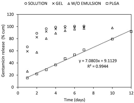 An ex vivo dissolution test, modified with respect to the conditions at the site of application, was performed. The bone grafts were impregnated with three different drug delivery systems representing different depot rates: hydrogel, water-in-oil emulsion, and polymeric solid dispersion. For comparison, an aqueous solution of antibiotics, which did not represent a depot formulation, was used. After impregnating the bone grafts with the antibiotic solution for 60 min, vancomycin hydrochloride was released within 2 days with a 24 h burst of 66%, whereas gentamicin sulphate was slowly released over 3 days with a 24 h burst of 55%. When an antibiotic hydrogel was used, the burst was reduced, and antibiotics release insignificantly prolonged. Hypromellose is a traditional drug carrier, and the release profiles are well described []. A higher-molar-mass hypromellose, designed for sustained drug release, was used in our work, and a 3% gel was prepared; however, the effects of the viscosity and gel structures on antibiotic dissolution remained below expectations. The W/O emulsion formed by an aqueous solution of antibiotics incorporated in the oil phase showed greater efficiency as a depot, presenting a burst of only ~25% and drug occurrence over five days. Finally, the release profile of antibiotics incorporated into PLGA was drastically different (Figure 8 and Figure 9), showing a one-day burst release of ~15%, which ensured both an adequate initial dose of the antibiotic and avoids toxic side effects on the bone grafts and surrounding tissues. Further, the lower molar mass of the chosen PLGA carrier and its branched structure with terminal hydroxyl groups eliminated the undesirable lag time in the drug release []. In addition, a sustained release of antibiotics by zero order kinetics was observed over a period of 12 days, possibly due to the ongoing hydrolytic degradation of the PLGA polymer. Thanks to its branched structure, there was no excessive swelling at the application site, which could adversely affect the healing process. Since drug release depends on the molar mass of PLGA, the antibiotic release time can be adjusted by choosing a polymer with a lower or higher molar mass [].