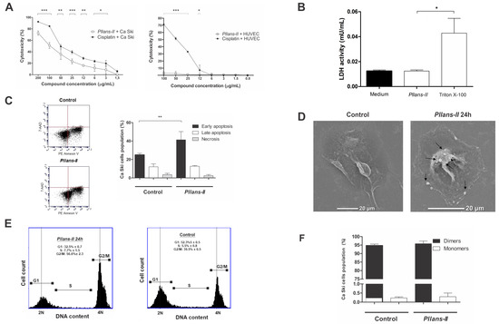 Pllans–II induces apoptotic death and cell cycle arrest in Ca Ski. (A) Cytotoxic activity of Pllans–II and Cisplatin® on squamous epithelial cells of cervical cancer and non–tumorigenic cells; Ca Ski cells and non–tumorigenic line of human endothelial cells (HUVEC) were treated with concentrations of serial dilutions (200–1.5 μg/mL) of both Pllans–II and Cisplatin®. (B) Effects of Pllans–II (100 μg/mL) on lactate dehydrogenase (LDH) levels in Ca Ski cell medium after 24 h of treatment. Data are expressed as mean ± SD, and procedures were carried out in triplicate. (C) Flow cytometry analysis of cell death generated in Ca Ski cells by Pllans–II treatment (100 μg/mL). The dot plot revealed the percentage of cells in early apoptosis (lower right quadrant), late apoptosis (upper right quadrant), and necrosis (upper left quadrant). The bar chart shows the percentages of cells at each stage. (D) Morphological changes induced by Pllans–II (100 μg/mL) on Ca Ski cells, detected by scanning electron microscopy (SEM). The formation of apoptotic bodies (marked with arrows) and size reduction is evident on Pllans–II treated Ca Ski cells. (E) Effect of Pllans–II (100 μg/mL) on the cell cycle of Ca Ski cells. The DNA content in each phase of the cell cycle was analyzed by flow cytometry. Pllans–II induced a significant decrease in the number of 2N cells in G1 phase and an increase in the number of cells in G2/M phase compared to the control after 24 h of incubation. (F) Effect of Pllans–II on the mitochondrial membrane potential in Ca Ski cells. The alteration to Δψm was analyzed by flow cytometry staining with JC–1, after the cells were incubated with 100 µg/mL of Pllans–II and RPMI 1640 medium as a control. At the time of evaluation, the percentages of cells found with the JC–1 probe in monomeric and dimeric form for each treatment are shown. There are no statistically significant differences between treatments. Statistically significant differences are observed with *** p < 0.001, ** p < 0.01, and * p < 0.05.