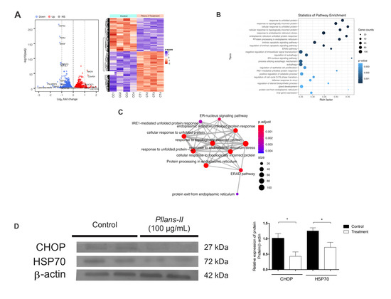 Pllans–II does not affect mitochondrial integrity but alters genes’ expression related to the response to endoplasmic reticulum stress. (A) Analysis of differentially expressed genes (DEG) from Ca Ski cells treated with Pllans–II and control. The red dots in the volcano plot represent genes with significantly higher expression in the treatment (up–regulated), while the blue dots represent genes significantly sub–expressed in the treatment group (down–regulated). The gray dots indicate genes that are not differentially expressed. The heat map shows changes in gene expression for each of the treatment and control samples. The red and blue colors represent, respectively, the increase and decrease in expression, while the white color indicates no change. (B) Pathway enrichment analysis. The term (Y–axis) represents the identification code and the pathway for the GO and KEGG databases. Asterisk (*) indicates the pathway found significant for KEGG. The enrichment factor (X–axis) represents the relationship between the number of differentially expressed genes and the total number of genes in a given pathway. The area of each colored circle is proportional to the number of genes involved in each pathway; the color indicates the p–adjusted value. (C) The most affected functional module of enriched terms map from Ca Ski cells treated with Pllans–II. The relation of the top–30 significantly richer terms (by p–adjusted values) are indicated by the thickness of the lines and represent the amount of DEG shared between each pair of terms. The size of each node indicates the gene count (number of genes enriched in each category) and the color represents the adjusted p–value. (D) Western blot analysis of HSP70, CHOP, and Actin protein after treatment with Pllans–II (100 μg/mL). The densitometry of bands was quantified by ImageJ software and represented in a histogram.