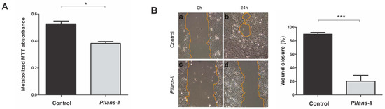 The ability of Pllans–II to inhibit cell adhesion and migration was evaluated by the MTT colorimetric assay and the wound healing assay, respectively. As shown in Figure 3A, the percentage of cells that metabolized MTT was 20% higher in the control indicating a significant inhibition of cell adhesion for treatment with the protein. Additionally, the migratory capacity of the cells treated with Pllans–II was highly inhibited after 24 h compared to control (Figure 3B).