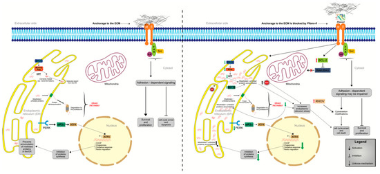 Representative model of antitumoral effects of Pllans–II on Ca Ski cells. The left part represents normal processes in untreated Ca Ski cells, where the ECM anchoring processes, the unfolded protein response (UPR), and the ER–associated protein degradation system (ERAD), develop in the endoplasmic reticulum, keeping the cells viable. The right part represents the possible effect of Pllans–II on cervical tumor cells. Pllans–II interferes initially with the binding of integrins to the ECM, which would affect cell adhesion and migration. In addition, this interaction could interfere with signaling pathways in the cell and modify the expression profile of genes related to UPR, mitochondrial permeabilization, and the ERAD pathway, which is usually responsible for the clearance of misfolded/unfolded proteins in ER. These effects would generate an increase in the stress on the endoplasmic reticulum in treated Ca Ski cells and not resolve it, leading to arrest in the cell cycle and apoptosis. Red arrows mean up–regulation, and green arrows mean down–regulation.