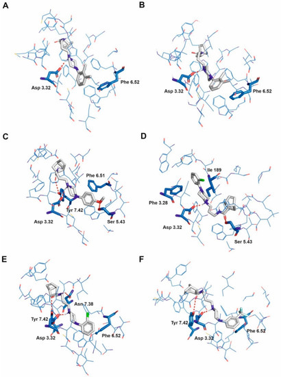 Standard Precision (SP) method of molecular docking with Glide [54] from Schrödinger release 2019-4 was applied. The grid files were obtained based on co-crystallized ligands. The selected receptors hydroxyl groups in the active sites were made flexible as previously reported [22,23]. Hence, 200 poses were generated in the case of each ligand-receptor complex. The poses were then filtered to ensure the interaction of the conserved Asp3.32 (Ballesteros-Weinstein numbering [55]) of the receptor with a protonatable nitrogen atom of the ligand. The final poses were identified by consideration of Glide docking scores and based on the visual inspection. Maestro Release 2019.4 [52] and PyMol 2.0.4 [56] software were used for visualization of molecular modeling results.