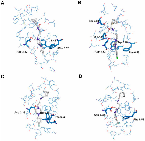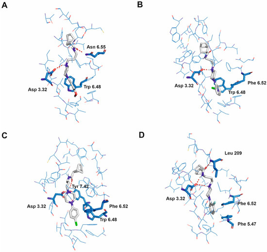 Selected ligands in complex with serotonin 5-HT2A receptor: Norbo-7 (A), Norbo-10 (B), Norbo-11 (C) and Norbo-15 (D). Protein shown in wire representation with blue carbon atoms. The most important residues shown as sticks. Ligands shown as sticks with grey carbon atoms. Polar interactions shown as red dashed lines. All hydrogen atoms of the receptor and non-polar hydrogen atoms of the ligands omitted for clarity.