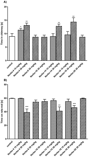 The influence of the tested compounds Norbo-4, Norbo-8, Norbo-10, Norbo-14, Norbo-18 and Norbo-20 (15 and 30 mg/kg) on motor coordination in mice evaluated in chimney (A) and rota-rod (B) tests. Investigated compounds were injected i.p. 60 min before the test. Data are expressed as mean ± SEM values of the 1 independent experiment. * p < 0.05; ** p < 0.01; *** p < 0.001 vs. control (Dunnett’s test). One-way ANOVA showed significant changes in the time in chimney after administration of the compound Norbo-4 (F(2,21) = 6.276; p < 0.01), Norbo-14 (F(2,21) = 5.615, p < 0.05 and Norbo-18 (F(2,21) = 5.381, p < 0.05) (A) and the time spent on the rota-rod for compound Norbo-4 (F(2,21) = 17.56; p < 0.0001), Norbo-14 (F(2,21) = 7.439, p < 0.01 and Norbo-18 (F(2,21) = 7.591, p < 0.01) (B). Dunnett’s post hoc test confirmed a significant increase of time in chimney after the administration of compound Norbo-4 administrated at the doses of 15 (p < 0.05) and 30 mg/kg (p < 0.01), Norbo-14 at the dose of 30 mg/kg (p < 0.01) and Norbo-18 at the dose of 30 mg/kg (p < 0.01) (A). These compounds decreased also time on rota-rod at the dose of 30 mg/kg (Norbo-4 (p < 0.001); Norbo-14 (p < 0.01) and Norbo-18 (p < 0.001)) (B).