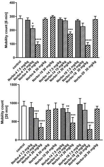 The influence of the tested compounds Norbo-4, Norbo-8, Norbo-10, Norbo-14, Norbo-18 and Norbo-20 (7.5–30 mg/kg) on the spontaneous locomotor activity of mice. Investigated compounds were injected i.p. 60 min before the test. Locomotor activity was measured after 6 and 20 min. Data are expressed as mean ± SEM values of the 1 independent experiment. * p < 0.05; ** p < 0.01; *** p < 0.001; **** p < 0.0001 vs. control (Dunnett’s test). One-way ANOVA showed significant changes in locomotor activity of mice in 6 min after administration of the compound Norbo-4 (F(3,24) = 22.94; p < 0.0001), Norbo-14 (F(3,24) = 13.41, p < 0.0001 and Norbo-18 (F(3,24) = 23.51, p < 0.001). Dunnett’s post hoc test confirmed a significant decrease in locomotor activity of mice after the administration of compound Norbo-4 administrated at the doses of 15 (p < 0.05) and 30 mg/kg (p < 0.0001), Norbo-14 at the dose of 30 mg/kg (p < 0.001) and Norbo-18 at the dose of 30 mg/kg (p < 0.0001) after 6 min of observation. One-way ANOVA reveled also significant changes in locomotor activity of mice in 20 min after administration of the compound Norbo-4 (F(3,24) = 39.23; p < 0.0001), Norbo-14 (F(3,24) = 22.27, p < 0.0001 and Norbo-18 (F(3,24) = 36.73, p < 0.001). Dunnett’s post hoc test confirmed a significant decrease in locomotor activity of mice after the administration of compound Norbo-4 administrated at the doses of 15 (p < 0.001) and 30 mg/kg (p < 0.0001), Norbo-14 at the doses of 15 (p < 0.01) and 30 mg/kg (p < 0.0001) and Norbo-18 at the dose of 30 mg/kg (p < 0.0001) after 20 min of observation.