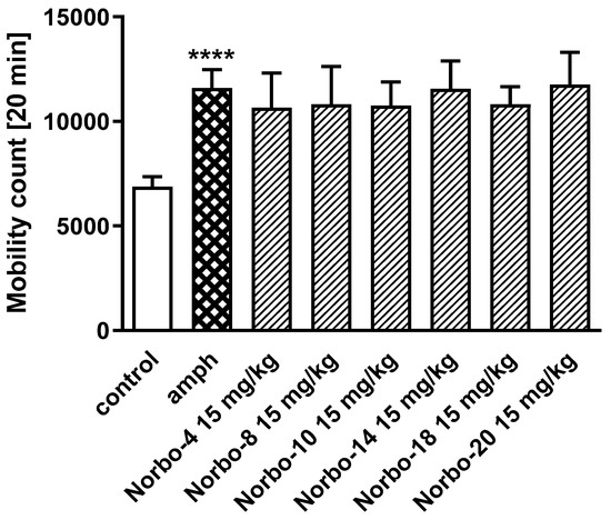 The influence of the tested compounds Norbo-4, Norbo-8, Norbo-10, Norbo-14, Norbo-18 and Norbo-20 (15 mg/kg) on the amphetamine-induced hyperactivity of mice. Compounds tested were injected 60 min and amphetamine 5 mg/kg 30 min before the test. Locomotor activity was measured for a period of 20 min. Data are expressed as mean ± SEM values of the 1 independent experiment. **** p < 0.001 vs. control. One-way ANOVA did not showed significant changes in the locomotor activity of mice [F(7, 53) = 1601; p = 0.1555]. Dunnett’s post hoc test confirmed a significant increase in locomotor activity of mice after the administration of amphetamine (5 mg/kg) (p < 0.001). However, the administered compounds had no influence on amphetamine-induced hyperactivity of mice (p > 0.05).