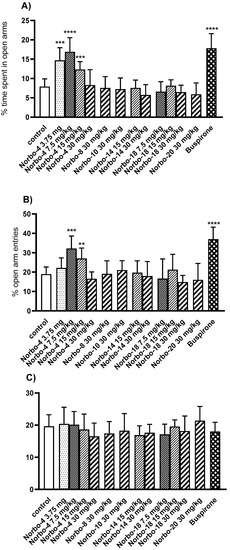 FST is a simple and fast test established in experimental pharmacology for detecting the antidepressant effect of tested substances [43]. The mouse placed in a beaker with water, without the possibility of escaping, initially makes intensive attempts to get out, but after a short time it gives up and adopts an attitude known as immobility. Selective serotonin reuptake inhibitors (SSRIs) are an example of antidepressants active in this test. They block the serotonin transporter (SERT) protein, which transports serotonin, and reduce its reuptake from the synaptic cleft. Due to their effectiveness, they are one of the most commonly used drugs in the treatment of depression. This group includes, among others, sertraline, which is a 5-HT1A agonist. Sertraline at the dose of 15 mg/kg used in our experiments significantly shortened the immobility time of mice. The tested compound Norbo-4 at three doses of 15, 7.5, and 3.75 mg/kg and Norbo-18 (at the doses of 15 and 7.5 mg/kg) showed an antidepressant effect similar to fluoxetine, which was manifested by a significant reduction of immobility time of mice (Figure 8). This effect should be considered specific as the tested compound did not show a negative effect on the locomotor activity of mice (in the two lowest used doses) nor induce sedation (at a dose of 15 mg/kg). This suggests that the mice were able to cope with the sedation in this stressful confined space swimming situation. The twice-as-high dose was found to inhibit the CNS so strongly that the immobility time in this group was comparable to the control group. Meanwhile, the other tested compounds, at used doses, remained inactive in this test. Anxiety and stress-related disorders represent severe mental health conditions that affect the performance of daily tasks and represent a high cost to public health. Charles Darwin’s preliminary observation that animals and humans have similar traits in expressing emotions opens the possibility to study the mechanisms of mental disorders in other mammals (mainly rodents). The animal test for assessing anxiolytic effects, EPM, is based on the test animal’s aversion to open spaces [44]. Fear induced inhibition of exploratory activity affects entries into open arms in this task as a significant increase in the percentage of time spent on the open arms and the number of entries into open arms is observed with drugs that are clinically effective anxiolytics [45]. Therefore, this model has been used to assess the anxiolytic-like activity of new putative anxiolytic compounds [46]. Buspirone (5 mg/kg), used as a reference anxiolytic drug, also prolonged the time and increased the percentage of entries into the open arms (Figure 9). As in the FST test, also in this test, the Norbo-4 compound, used in three lower doses, i.e., 15, 7.5, and 3.75 mg/kg, increased the percentage of open arm exploration time, analogous to buspirone. Additionally, the increase in the percentage of entries into the open arms was statistically significant. The remaining compounds at the used doses were inactive in this test.