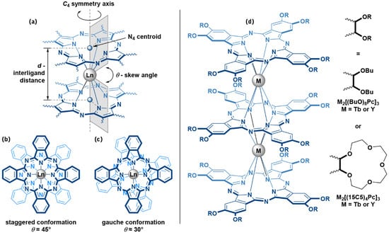(a) Structural characteristics d and θ, which determine coordination surrounding of lanthanide ion sandwiched between two Pc ligands; (b,c)—staggered (s-) and gauche (g-) conformations of Pc ligands in sandwich complexes; (d)—trisphthalocyaninates studied in the present work—M2[(BuO)8Pc]3—diterbium(III) or diyttrium(III) tris(octa-n-butoxyphthalocyaninates) and M2[(15C5)4Pc]3—diterbium(III) or diyttrium(III) tris(tetra-15-crown-5-phthalocyaninates).