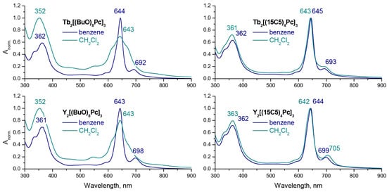 UV-vis spectra of the synthesized Tb(III) and Y(III) trisphthalocyaninates were measured in dichloromethane and benzene (Figure 2). The pronounced difference in the spectral appearance of M2[(BuO)8Pc] in aliphatic and aromatic solvents is in line with the previous report [17,18]. However, in the case of M2[(15C5)4Pc]3, only a negligible difference can be noted. To the best of our knowledge, this feature of crown-substituted complexes has never been reported before, and this result can be used as a marker of invariance of conformational state of the latter complex on either the aliphatic or aromatic nature of solvent.