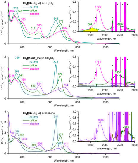 UV-vis-NIR spectra of neutral forms of Tb2[(BuO)8Pc]3 and Tb2[(15C5)4Pc]3 and their mono- and dicationic forms, obtained by 1e- and 2e-oxidation with OxSbCl6. The marker of the gauche conformation of Tb2[(BuO)8Pc]3+ in CH2Cl2 is highlighted with yellow colour. Asterisks mark the absorption of solvents.