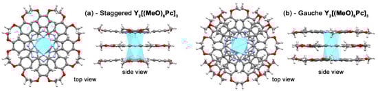 Top and side views on geometries of staggered (a) and gauche (b) conformations of Y2[(MeO)8Pc]3 according to BP86/def2-SVP calculations.