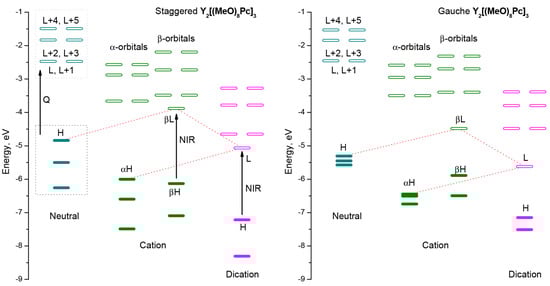 Frontier molecular orbitals responsible for the appearance of bands in UV-vis-NIR spectra of trisphthalocyaninates are formed from linear combinations of Pc-centred orbitals, i.e., HOMOs and pairs of degenerate LUMOs [36,58,59]. Depending on the molecular symmetries, the contributions of parent ligand orbitals can form bonding, nonbonding, and antibonding combinations (Figure 5). Thus, both conformations have the bonding and antibonding nature of HOMO-2 and HOMO respectively. However, HOMO-1 of g-conformer also becomes a bonding orbital with a significant contribution from the inner ligand, while the contribution from this ligand in s-form is zero. The antibonding nature of the neutral triple-decker HOMO is responsible for the decrease of the interligand distance upon the stepwise removal of electrons from this orbital.