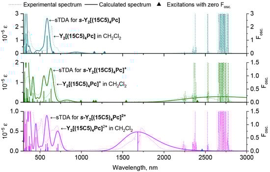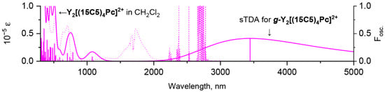 Optimized structures were used to predict the energies of vertical excitations in UV-vis-NIR spectra of trisphthalocyaninates within the simplified Tamm–Dancoff approximation (sTDA) [51,52,53] with CAM-B3LYP functional [54], def2-SVP basis set for light atoms and def2-ECP for yttrium. Previously, both simplified TDA and TDDFT were demonstrated to afford spectacular orders of magnitude speedup of calculations in comparison with full TDDFT without loss of accuracy or even providing more accurate results for prediction of UV-vis-NIR spectra of huge molecules, and they were widely applied for phthalocyanines and related compounds [45,55,56,57]. Herein, we used this method for the first time to treat triple-decker complexes, thus contributing to the history of successful use of simplified time-dependent DFT approximations.